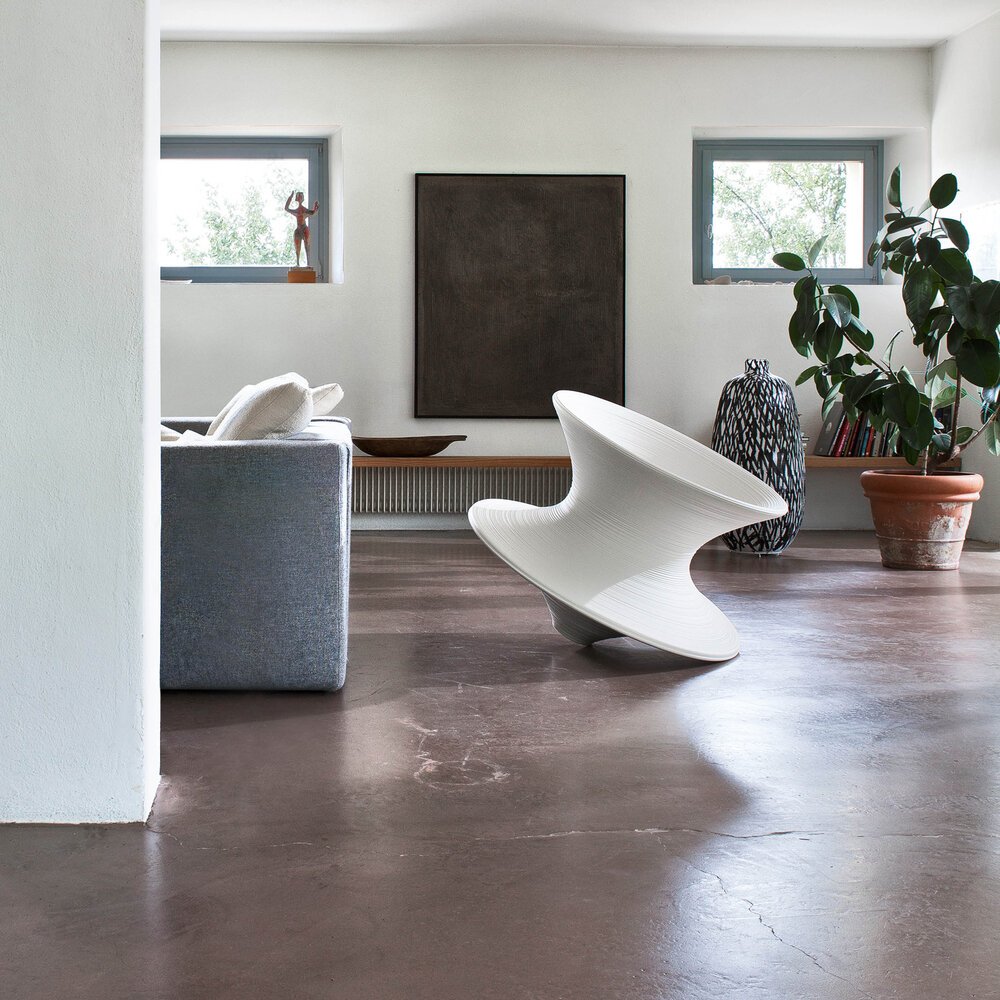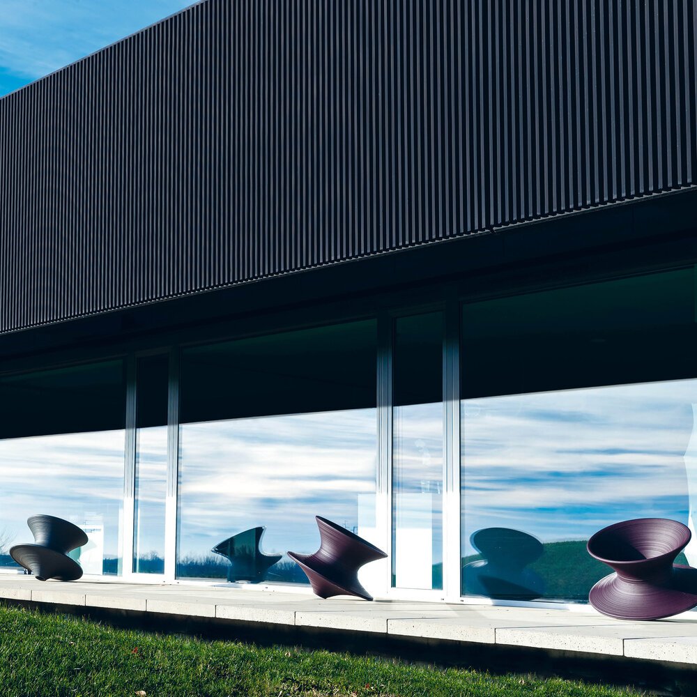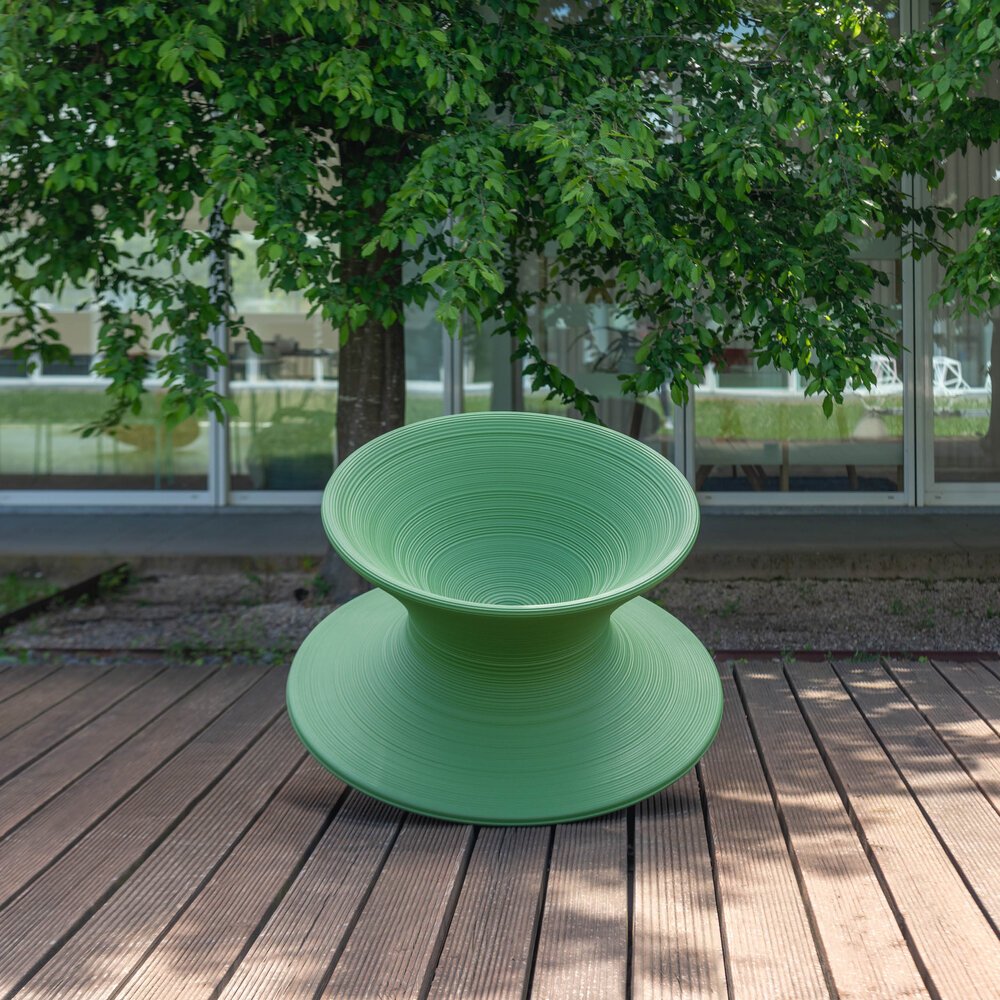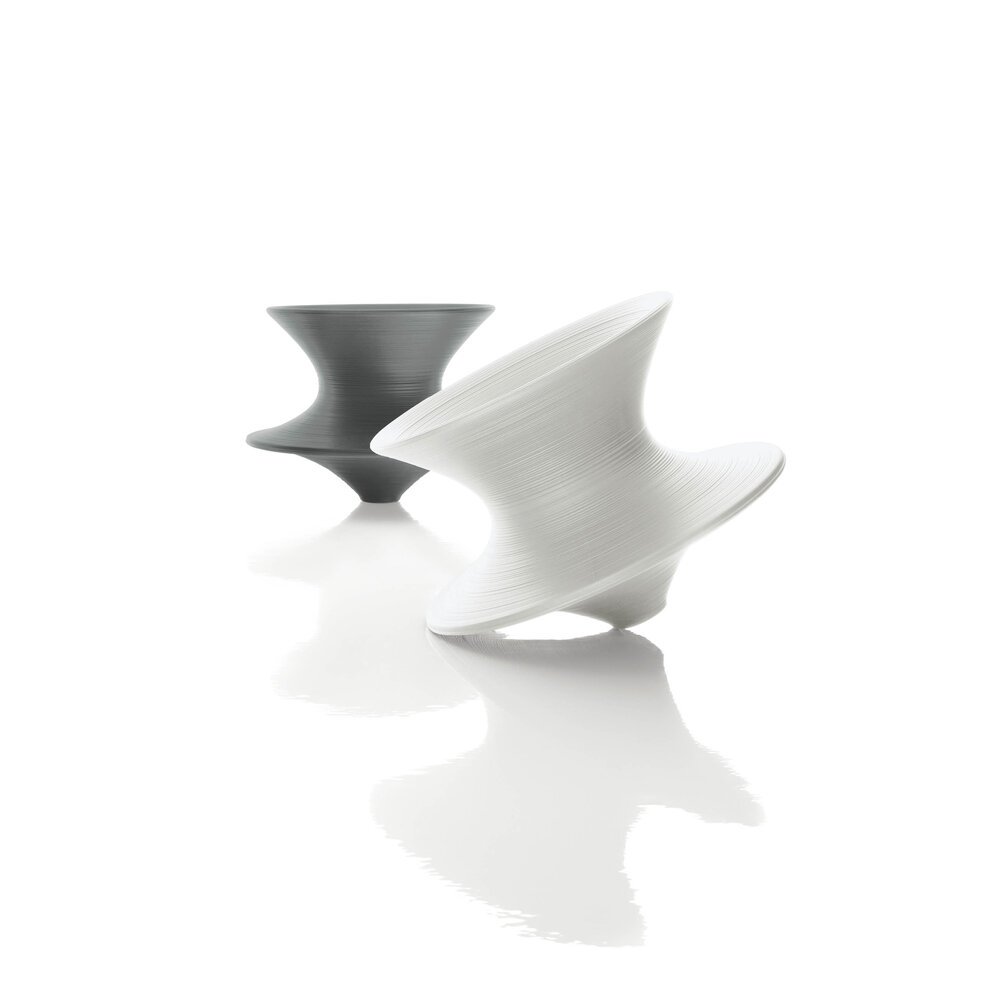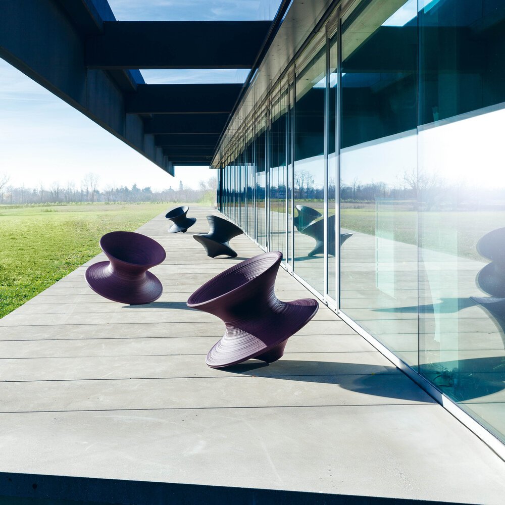 Spun, Thomas Heatherwick’in Magis için tasarladığı, sınırları zorlayan bir oturma deneyimidir. Dairesel formu sayesinde döner, devrilir, dengelenir — kullanıcıya klasik oturma alışkanlığının ötesinde eğlenceli, etkileşimli bir deneyim sunar. Tek bir koltuk gibi görünse de, aslında form ve hareketin birleşiminden doğan bir experience’tır. Dayanıklı polietilen malzemesiyle hem iç hem dış mekânlarda kullanılabilir; dünyanın birçok müze, galeri ve kamusal alanında ikonik bir obje haline gelmiştir.