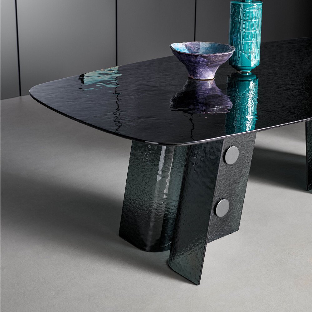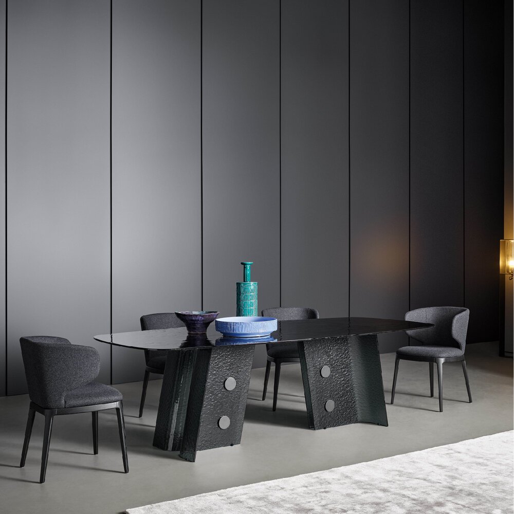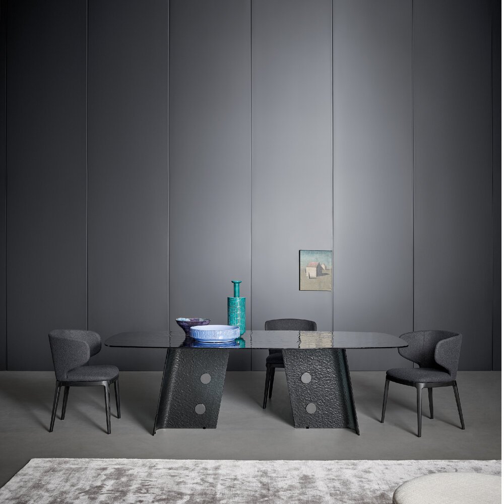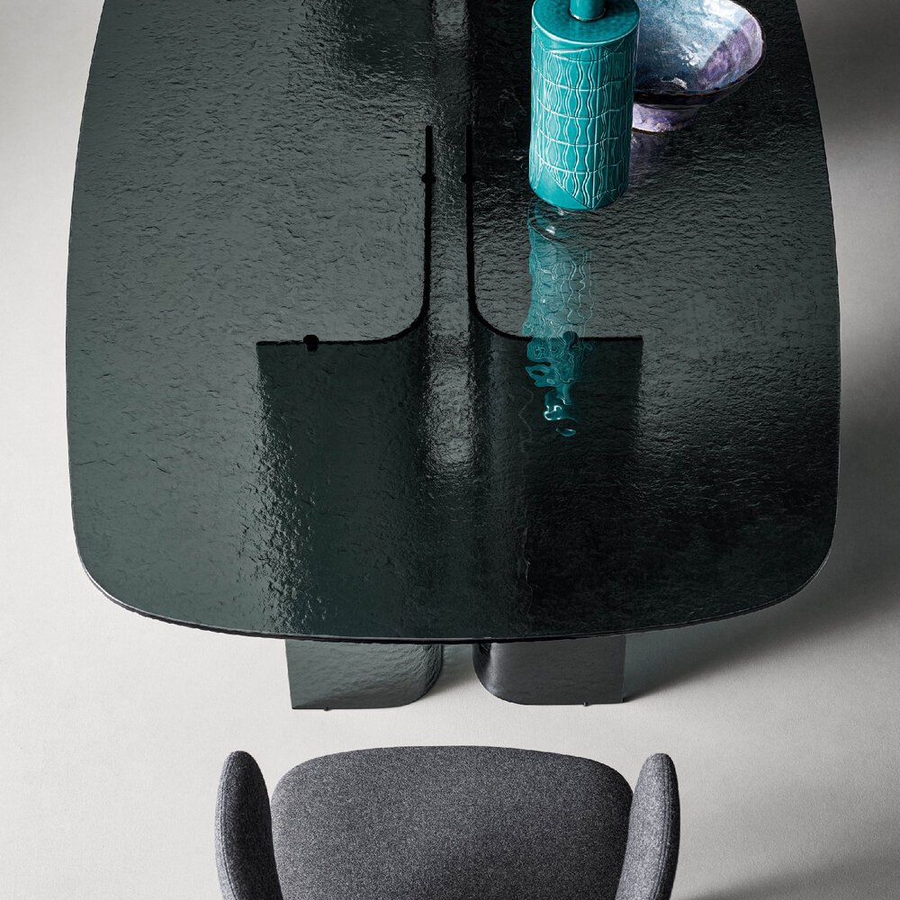 İspanyolca “düğme” anlamına gelen adından ilham alan Botón masa, bazasındaki metal detaylarla dikkat çeker. Füzyon temperli camdan üretilen tasarım, zarif ve sofistike duruşuyla yemek alanının merkezinde öne çıkar. Yuvarlatılmış dikdörtgen tabla, açılı cam ayaklar üzerinde yükselerek hem denge hem de modern bir estetik sunar.