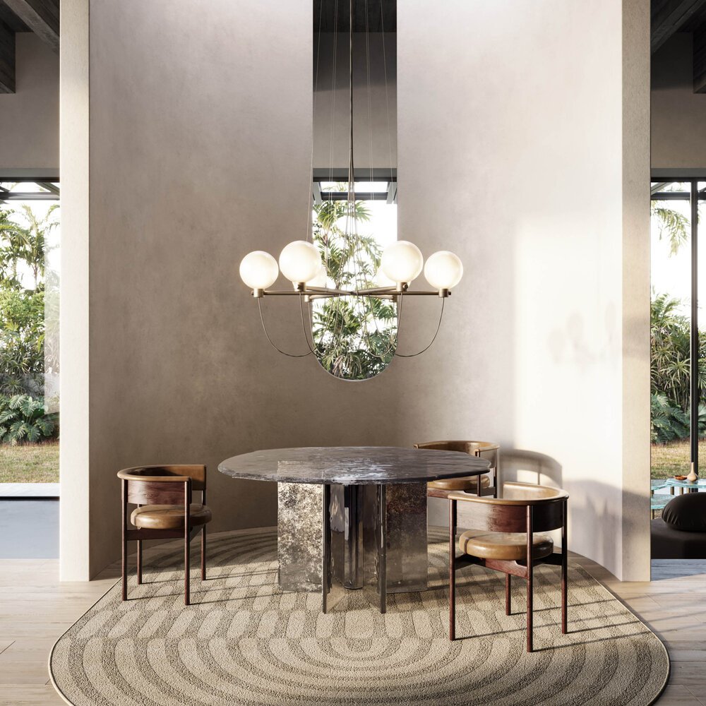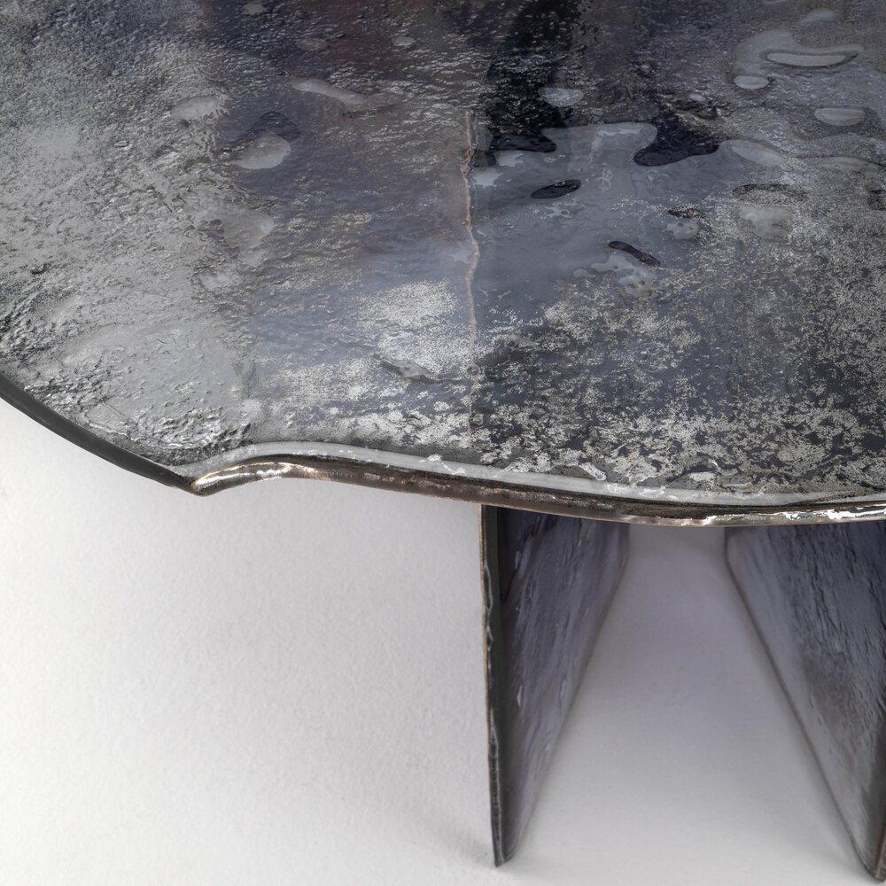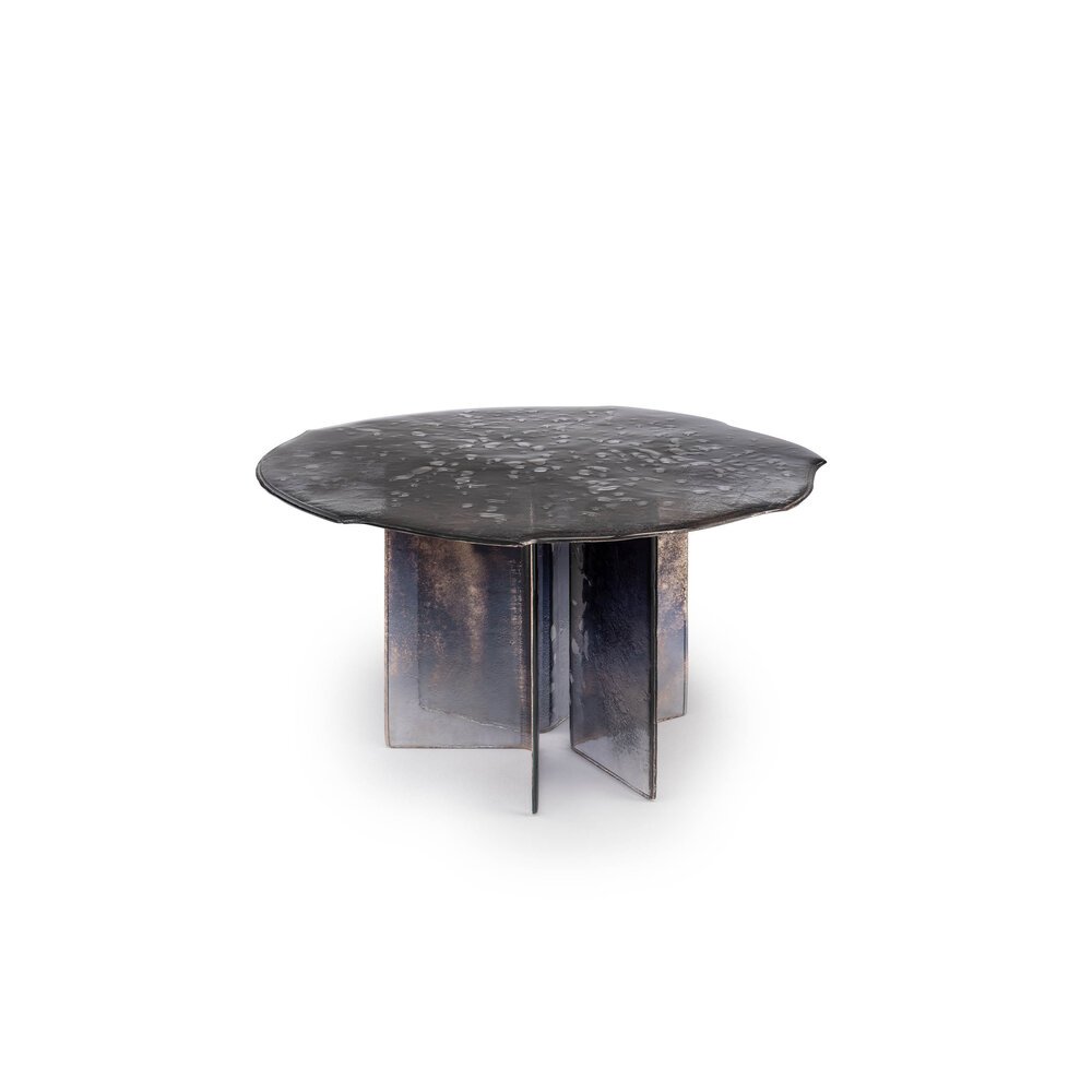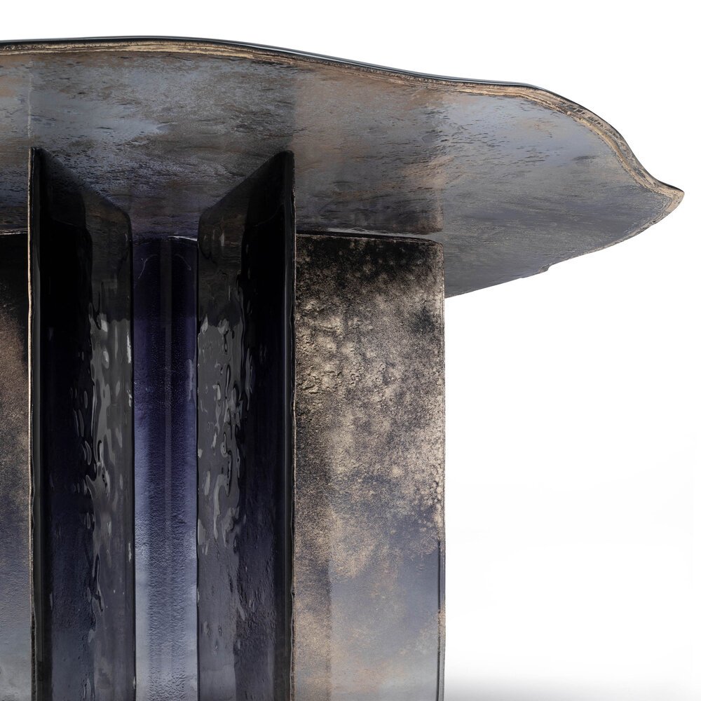 Gò, Murano cam ustalığı ile modern tasarımı birleştirir. İki katmanlı fırınlanmış cam tabla ve ayakları, düzensiz kenarlarla şekillendirildi; gece mavisinden transparan geçişli vernik ve arkada yer yer gümüşleme detaylarıyla zenginleştirildi. Ø156 cm çapı ve 75 cm yüksekliği ile geniş alanlarda zarif bir merkez unsur olarak hem işlevsellik hem de estetik sunar.
