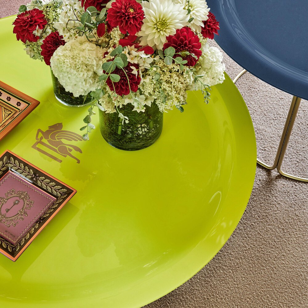 Lagoon, kavisli metal formuyla akıcı bir yapı sunarken parlak lake üst yüzey ve merkezde Etro logosuyla yaşam alanına dengeli bir şıklık katıyor.
