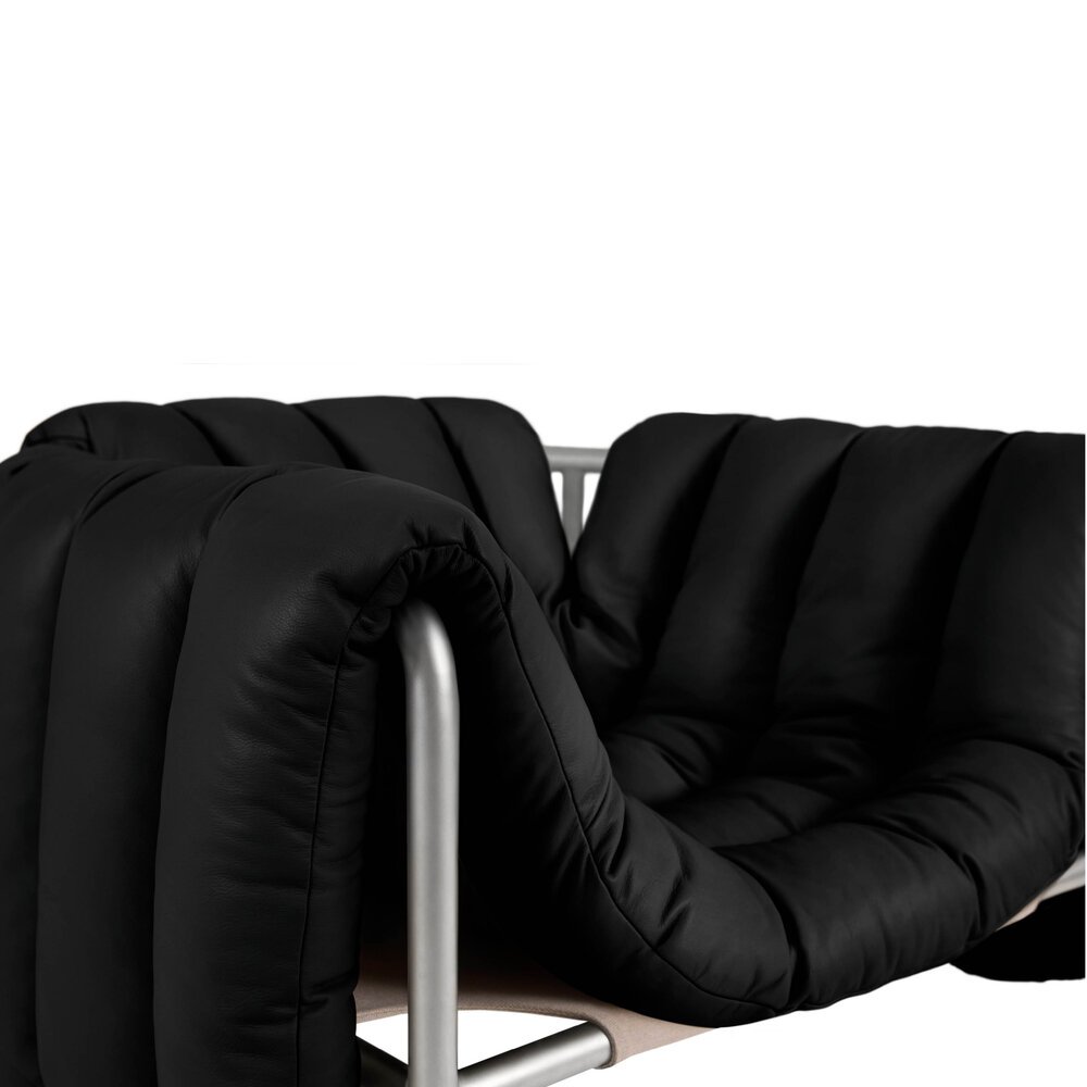 Hem’in Puffy Lounge Chair modeli, sert çizgili paslanmaz çelik iskeleti ile dolgun siyah deri yüzeyi arasında sürtünme yaratarak dikkat çekiyor. Tasarımcı Faye Toogood’un ustalığıyla klasik yapısal geometriyle bezemeli yumuşak formlar bir araya geliyor. Oturma kısmı, çerçevenin sınırlarını aşan bir “taşma” estetiği sunuyor, konforlu ve kapsayıcı. Farklı kumaş ve derilerle kişiselleştirilebilir olması, her mekâna özgünlük katma şansı sunuyor. Minimalizmin lüksle buluştuğu bir tasarım ifadesi.