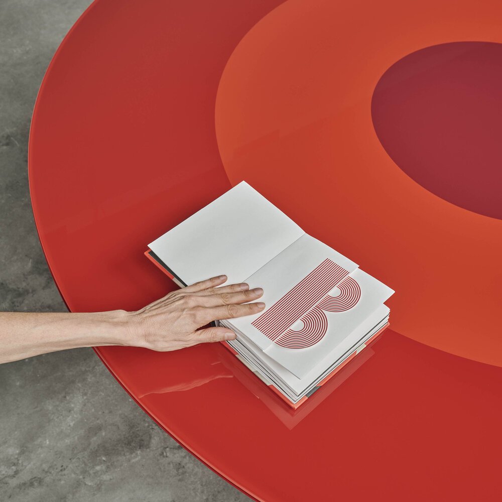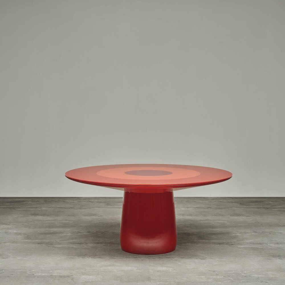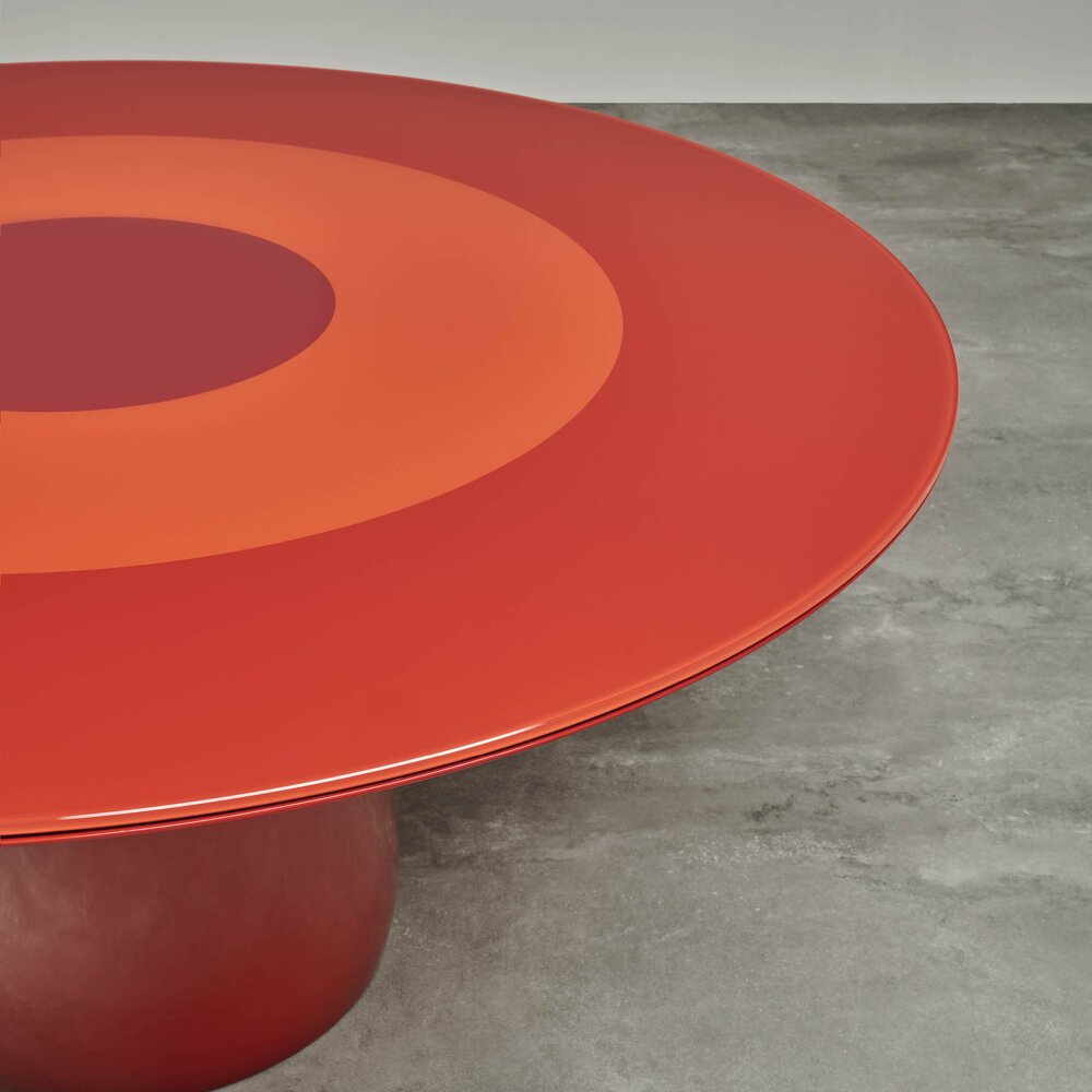 2018 yılında Claesson Koivisto Rune tarafından tasarlanan Roundel yuvarlak yemek masası, heykelsi duruşu ve grafik zarafeti bir araya getirir. Parlak laker kaplı poliüretan merkezi gövdesi kırmızı, beyaz veya siyah seçenekleriyle sunulur ve aynı tonlarda konsantrik desenlerle boyanmış temperli cam bir tabla ile tamamlanır. Üç konsantrik diskten oluşan tabla, kullanım alanlarını nazikçe ima ederken geometrik saflığını korur. Yuvarlak formu sayesinde Roundel, açıklığı, diyaloğu ve eşitliği destekler. Modern iç mekanlar için ideal olan masa, hem güçlü bir tasarım ifadesi hem de çok yönlü bir mobilya parçasıdır. Baleri Italia’nın zamansız çağdaş tasarıma olan bağlılığını yansıtır.