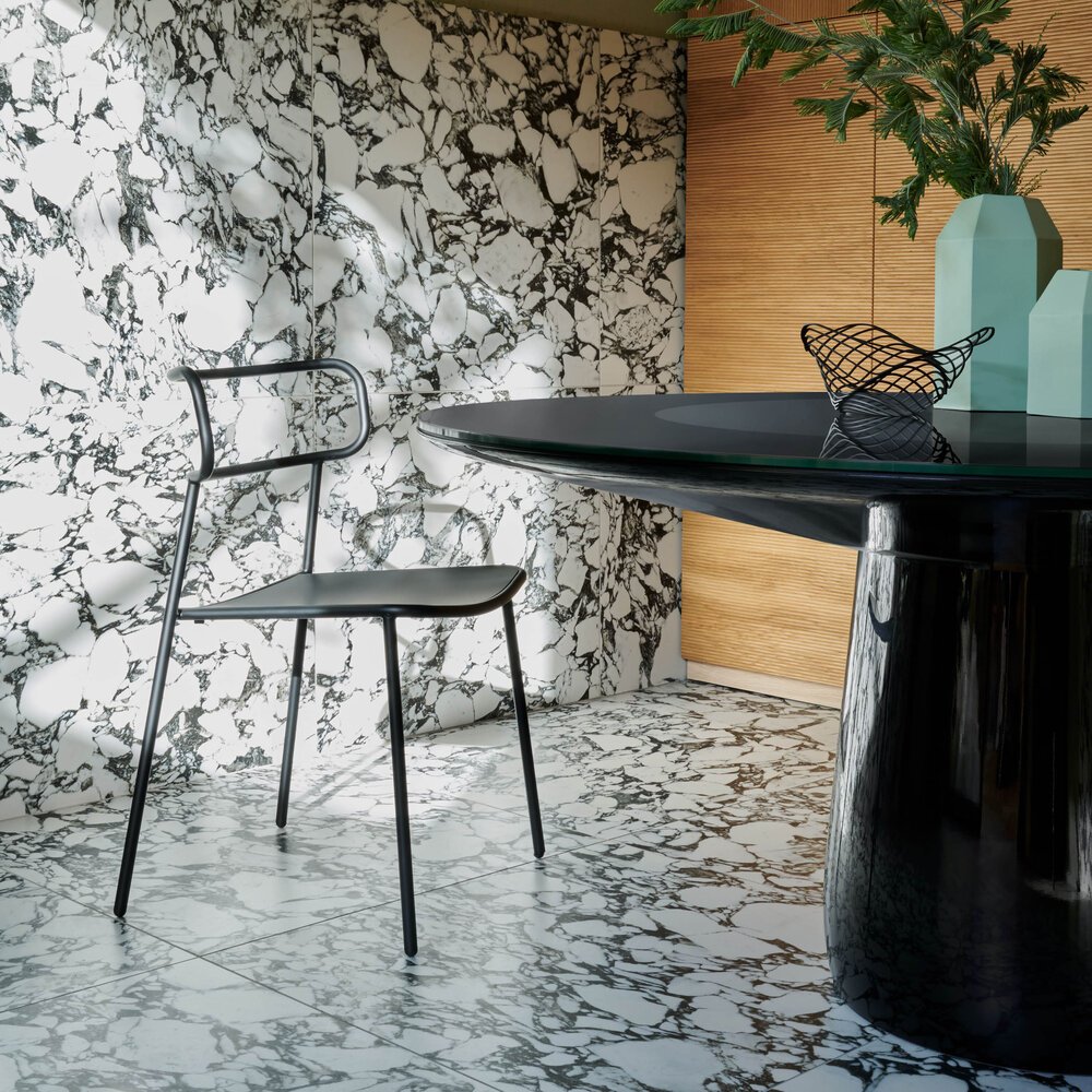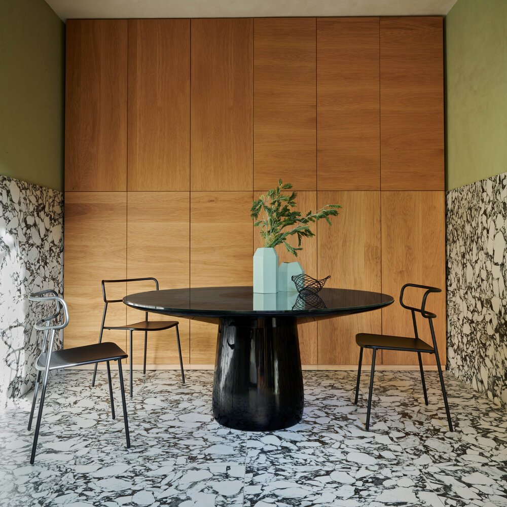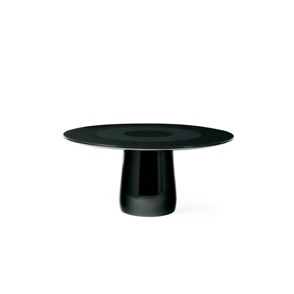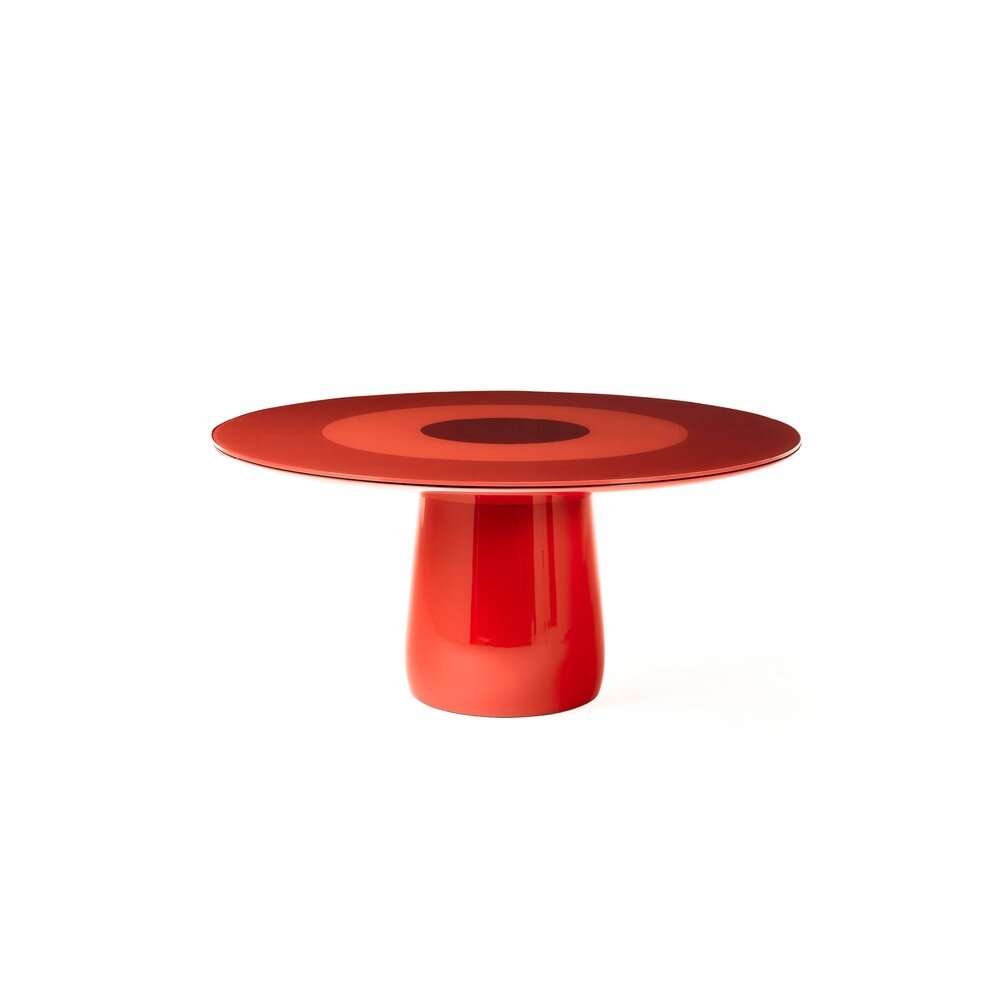 2018 yılında Claesson Koivisto Rune tarafından tasarlanan Roundel yuvarlak yemek masası, heykelsi duruşu ve grafik zarafeti bir araya getirir. Parlak laker kaplı poliüretan merkezi gövdesi kırmızı, beyaz veya siyah seçenekleriyle sunulur ve aynı tonlarda konsantrik desenlerle boyanmış temperli cam bir tabla ile tamamlanır. Üç konsantrik diskten oluşan tabla, kullanım alanlarını nazikçe ima ederken geometrik saflığını korur. Yuvarlak formu sayesinde Roundel, açıklığı, diyaloğu ve eşitliği destekler. Modern iç mekanlar için ideal olan masa, hem güçlü bir tasarım ifadesi hem de çok yönlü bir mobilya parçasıdır. Baleri Italia’nın zamansız çağdaş tasarıma olan bağlılığını yansıtır.