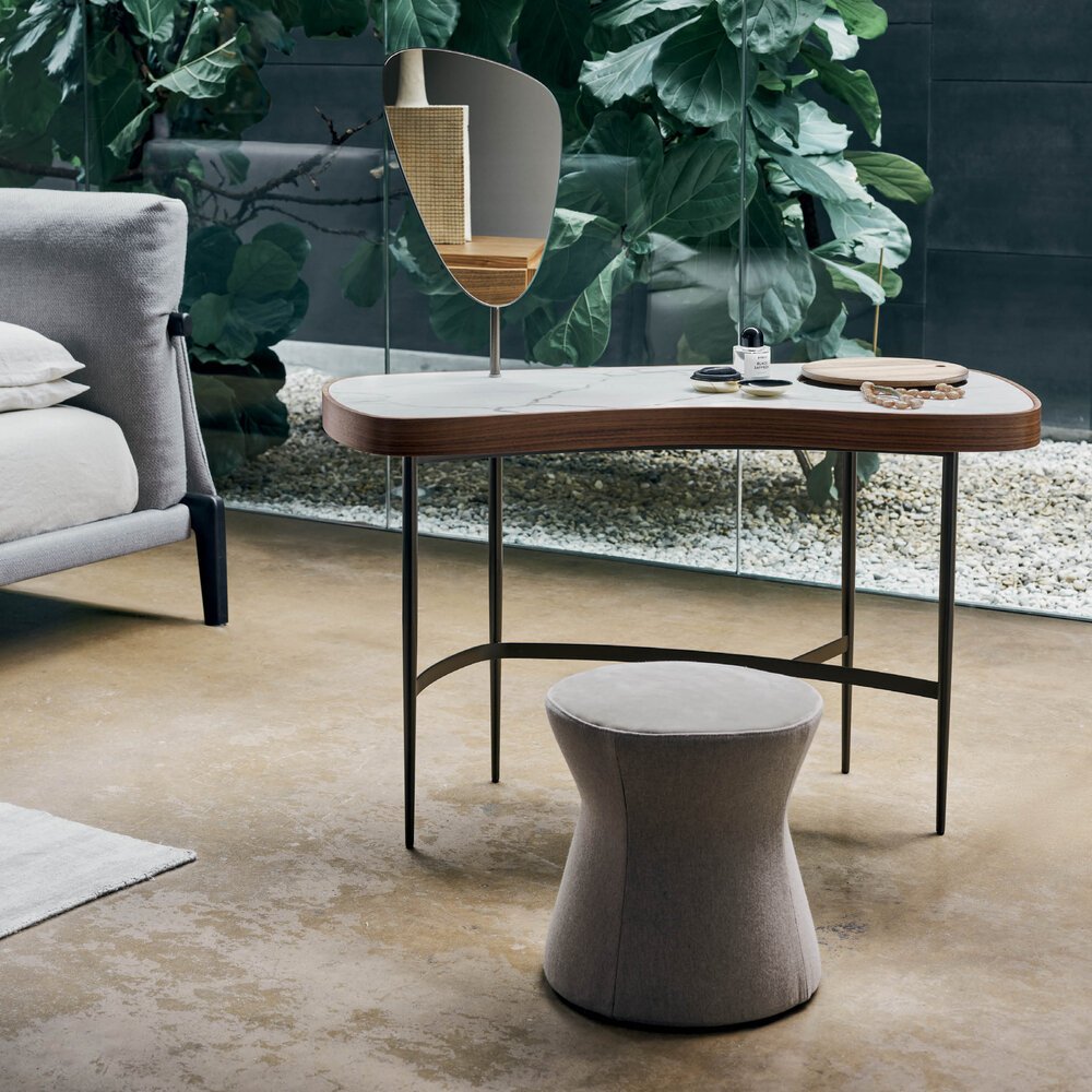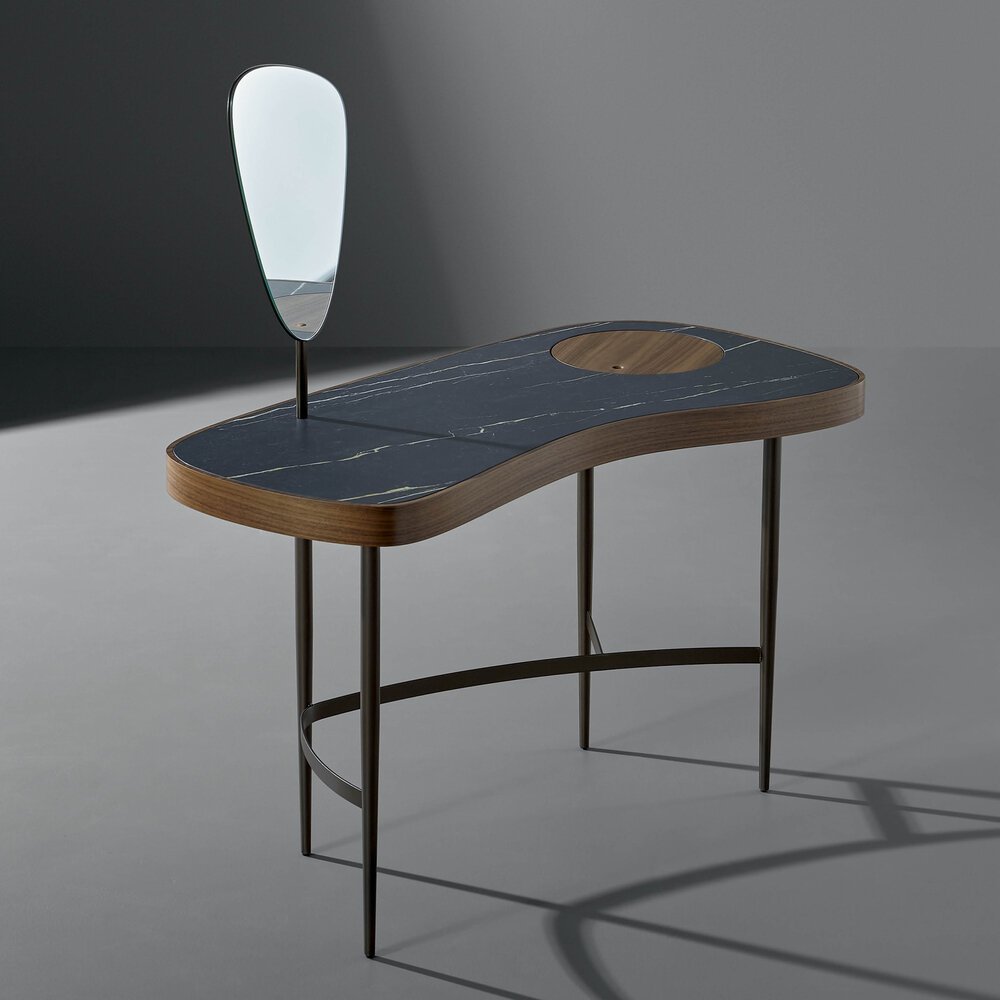 Venus, metal gövdeye sahip modern bir makyaj masasıdır; yuvarlatılmış hatlara sahip ahşap ve seramik üst tabla ile tasarlanmıştır. Makyaj aynası ve takı ya da küçük eşyalar için ceviz kapaklı saklama bölmesiyle hem şık hem işlevseldir.