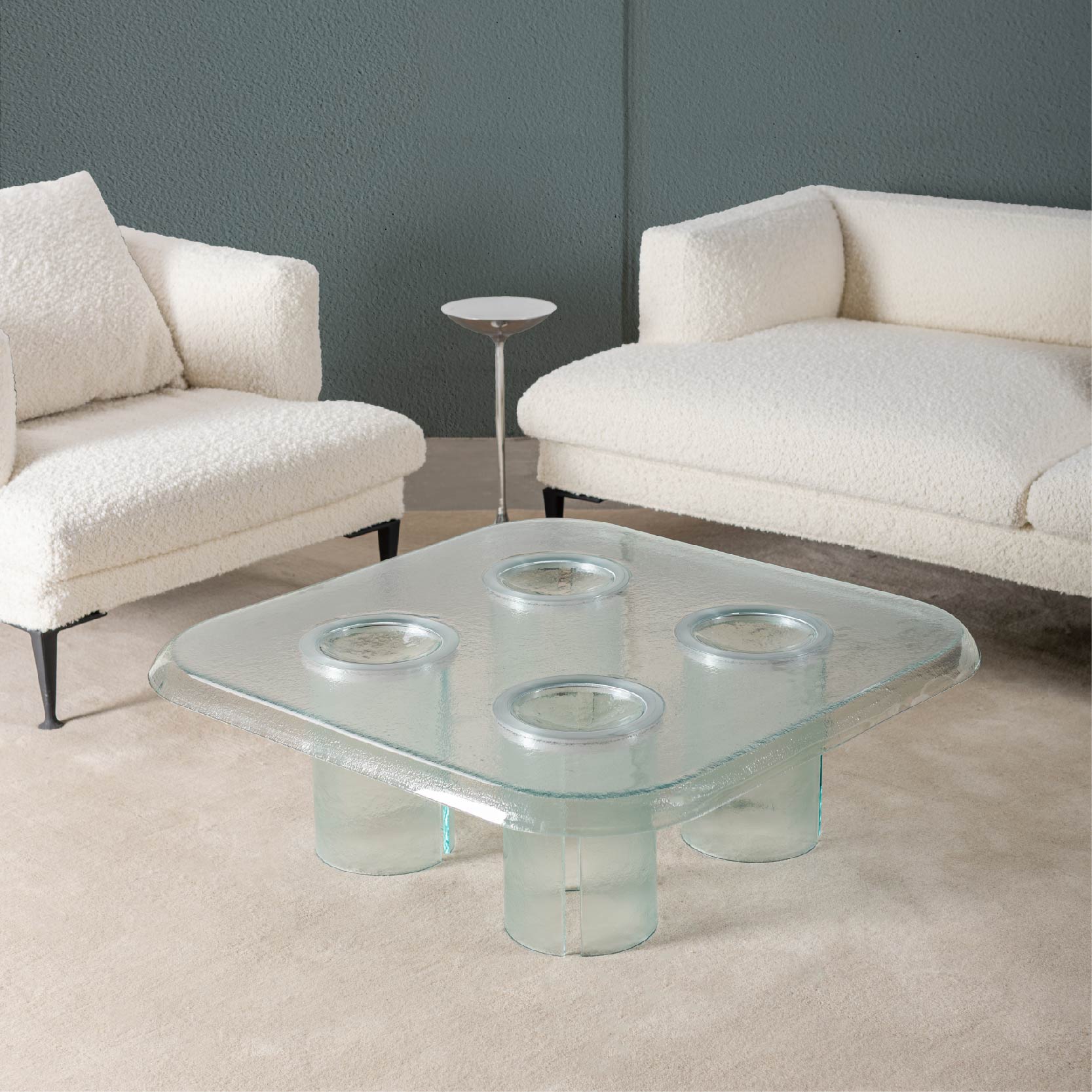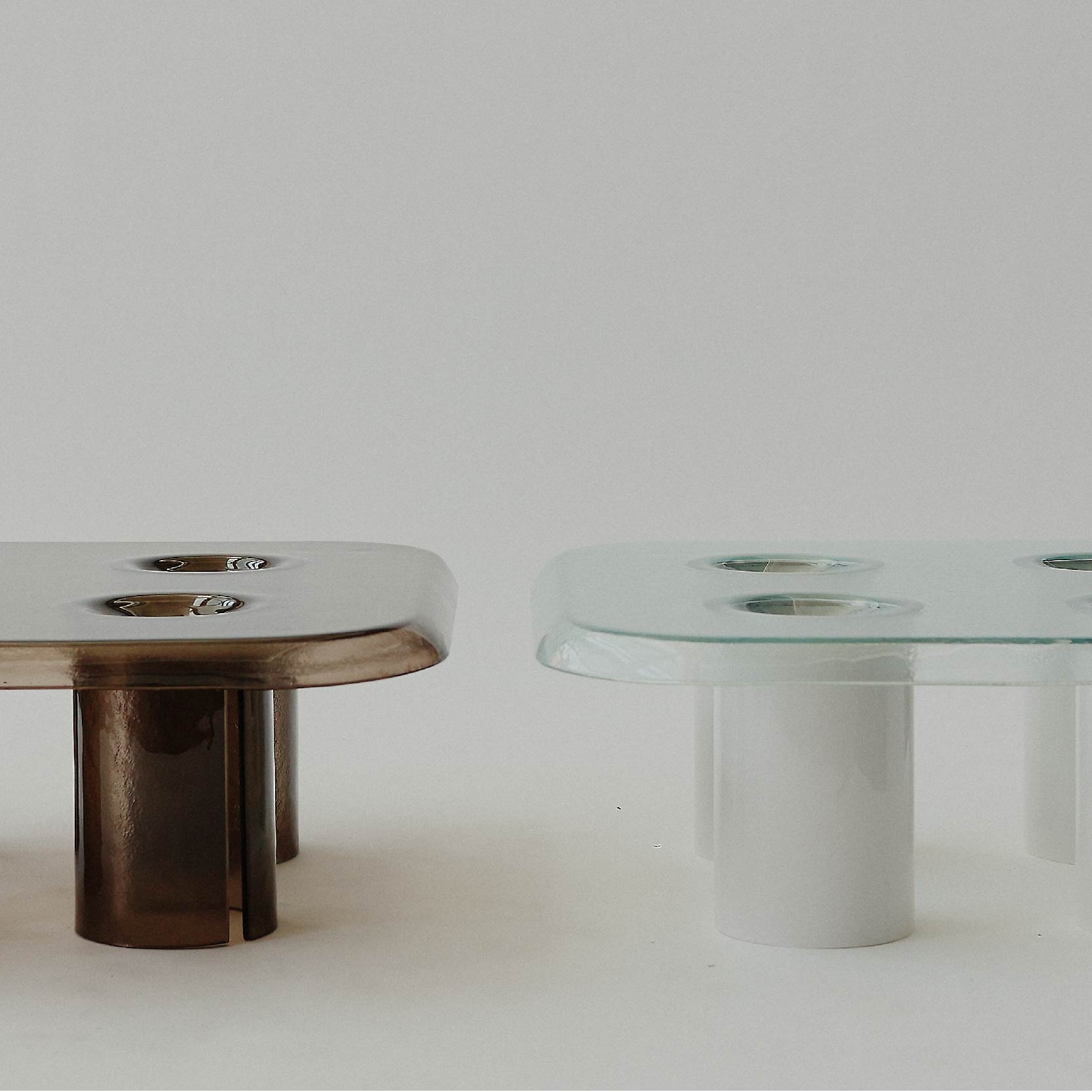Tek parça gibi algılanan formu, aslında camın termo-şekillendirme tekniğiyle biçimlendirilmesiyle elde ediliyor. Bu üretim yöntemi, cam yüzeyin neredeyse erimiş bir halde şekillenmiş gibi görünmesini sağlıyor. Saydam veya bronz tonlarda üretilen cam tabla, ortam ışığıyla birlikte her açıdan farklı yansımalar yaratıyor. Ayak yapısı, formu destekleyen zarif bir silindirden oluşuyor; bu da tasarımın dengesini güçlendirirken, materyalin kendi içinde nefes almasına izin veriyor.